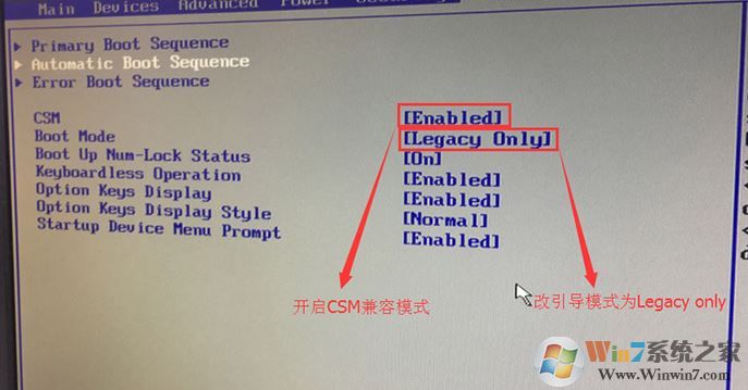 3、切換到Boot,把Boot Mode從UEFI改成Legacy only引導(dǎo)模式,再把csm默認(rèn)disabled改成enabled,開(kāi)啟兼容模式,選擇F10保存設(shè)置,在彈出的選項(xiàng)中選擇YES;