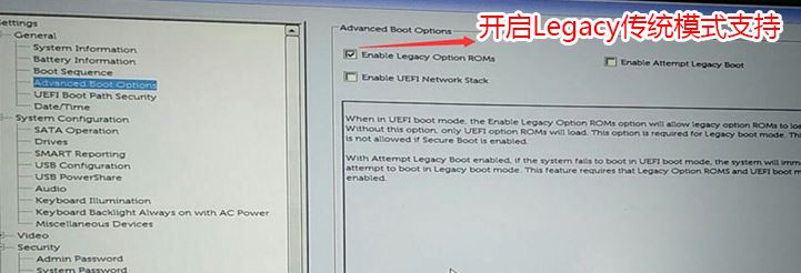 3、切換到Advanced Boot Options將右邊的Enable legacy option roms選項打勾,如下圖所示;