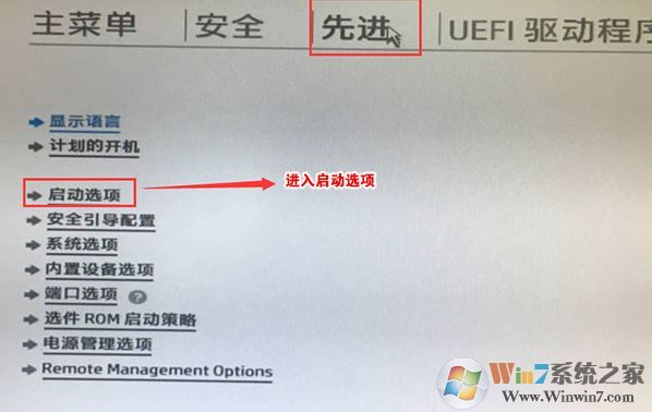 5、F10保存重啟后再次開(kāi)機(jī)按ESC,然后選擇F10進(jìn)入BIOS設(shè)置,將鼠標(biāo)移動(dòng)“先進(jìn)”選項(xiàng)中,選擇"啟動(dòng)選項(xiàng)"后回車(chē)進(jìn)入,如圖: