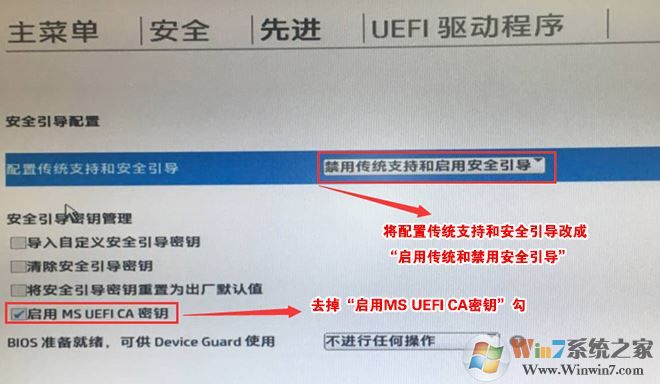 3、回車(chē)后,將配置傳統(tǒng)支持和安全引導(dǎo)設(shè)置電腦“啟用傳統(tǒng)支持和禁用安全引導(dǎo)”以及去掉“啟用MS UEFI CA密鑰”前面的勾,然后按F10保存更改;