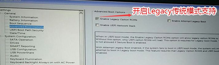 2、切換到Advanced Boot Options將右邊的Enable legacy option roms選項打勾,如下圖所示;