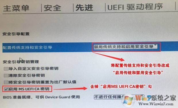 3、回車后,將配置傳統(tǒng)支持和安全引導設(shè)置電腦“啟用傳統(tǒng)支持和禁用安全引導”以及去掉“啟用MS UEFI CA密鑰”前面的勾,然后按F10保存更改,如圖: