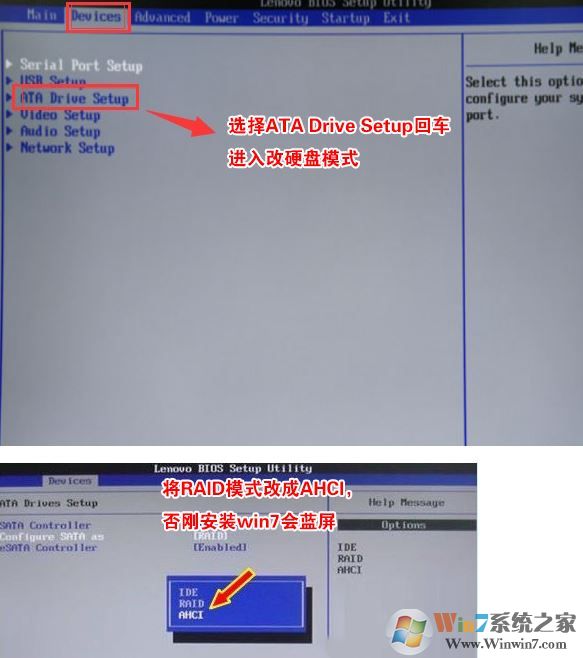 4、切將鍵盤(pán)移動(dòng)Devices選項(xiàng),把鍵盤(pán)移動(dòng)ATA Drive Setup回車,將configure SATA as中默認(rèn)的raid改成ahci模式,否則安裝win7時(shí)會(huì)出現(xiàn)0x0000007b藍(lán)屏,因?yàn)閣in7中沒(méi)有集成raid硬盤(pán)驅(qū)動(dòng),然后選擇F10保存設(shè)置,在彈出的選項(xiàng)中選擇YES,如下圖所示;