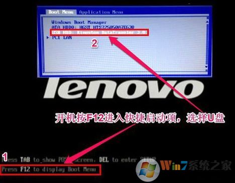 5、保存設(shè)置后自動重啟進(jìn)入LOGO畫面時,一直按F12,選擇U盤啟動,如下圖所示;
