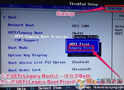 3、選擇startup,在UEFI/legac boot priority下,設(shè)置為Legacy First(傳統(tǒng)模式優(yōu)先)。