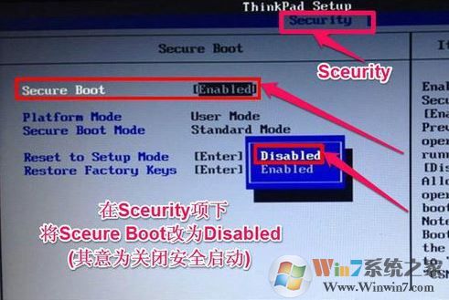2、按→方向鍵移動到Security,將secure boot改成disabled,關(guān)閉安全啟動,如下圖所示;