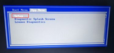 1、重啟筆記本按F12,按TAB鍵切換欄目到"App Menu",然后選擇"setup"進(jìn)入BIOS設(shè)置,或是看到lenovo或ThinkPad標(biāo)識后多次按Enter回車,聽到報警聲后等待下一畫面,然后按F1或Fn+ F1進(jìn)入BIOS主界面。如下圖所示;