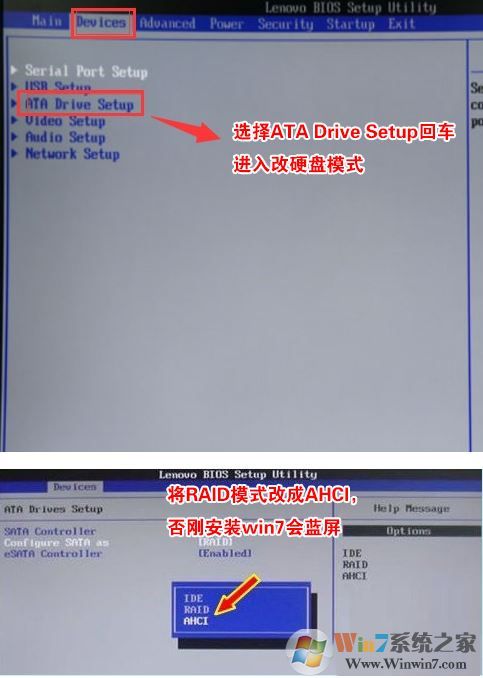 4、切將鍵盤移動Devices選項(xiàng),把鍵盤移動ATA Drive Setup回車,將configure SATA as中默認(rèn)的raid改成ahci模式,否則安裝win7時(shí)會出現(xiàn)0x0000007b藍(lán)屏,因?yàn)閣in7中沒有集成raid硬盤驅(qū)動,然后選擇F10保存設(shè)置,在彈出的選項(xiàng)中選擇YES,如下圖所示;