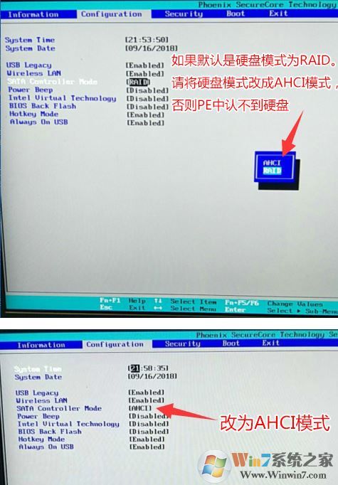 6、注意:再返回configuration這項(xiàng),查看sata controller mode這項(xiàng),如果默認(rèn)硬盤模式為RAID,請(qǐng)將硬盤模式改為AHCI模式,否則進(jìn)PE后不能認(rèn)出硬盤,如果更改后記得按F10保存,如下圖所示;