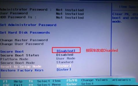 1、開機(jī)一直按F2或(FN+F2)進(jìn)入BIOS,按→方向鍵切換到Security,選擇Secure Boot回車設(shè)置成Disabled,如下圖所示;
