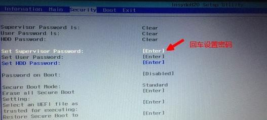 2、如果Secure Boot灰色無法設(shè)置,則轉(zhuǎn)到Security,選擇Set Supervisor Password回車設(shè)置密碼,再返回BOOT選項(xiàng),將Secure BOOT默認(rèn)enabled為disabled,(注:改完secure boot后再設(shè)置密碼為空即可,要不每次進(jìn)BIOS都要設(shè)置)如下圖所示;