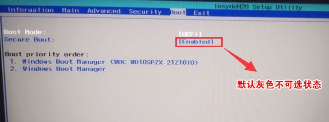 1、開機(jī)一直按F2進(jìn)入BIOS,按F2進(jìn)入BIOS界面,選擇BOOT項(xiàng)后發(fā)現(xiàn)secure boot灰色不可選狀態(tài),如下圖所示;