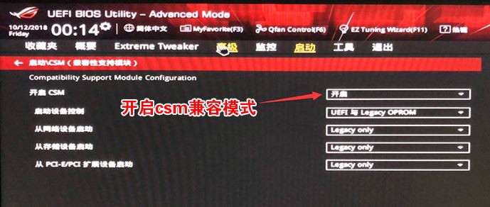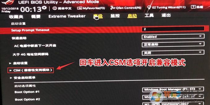 4、再返回到"啟動(dòng)"的選項(xiàng),把CSM由disabled改成enabled,開啟兼容模式,然后按F10保存如下圖所示;