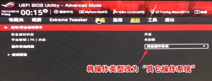 3、再返回到"安全啟動(dòng)菜單"的選項(xiàng),將操作系統(tǒng)類型改成"其它操作系統(tǒng)",如下圖所示;