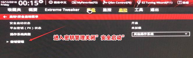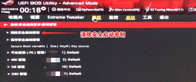 2、進(jìn)入高級(jí)模式后,按→方向鍵移動(dòng)到"啟動(dòng)"選項(xiàng),選擇安全啟動(dòng)菜單,然后回車進(jìn)入密鑰管理清除密鑰關(guān)閉安全啟動(dòng),如下圖所示;
