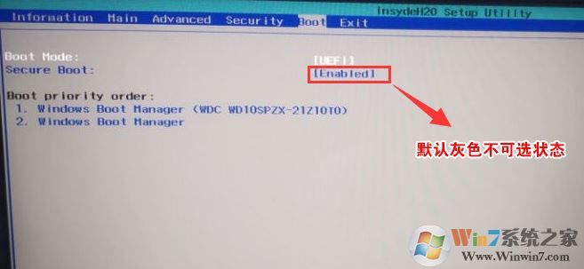 1、開機一直按F2進入BIOS,按F2進入BIOS界面,選擇BOOT項后發(fā)現(xiàn)secure boot灰色不可選狀態(tài),如下圖所示;