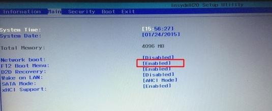 4、轉到Main,選擇F12 Boot Menu回車,設置為Enabled,按F10選擇Yes回車保存修改,如下圖所示;