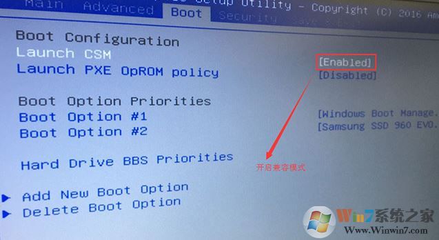 2、切換到BOOT的選項(xiàng),把Launch CSM由disabled改成enabled,開(kāi)啟兼容模式,然后按F10保存設(shè)置;