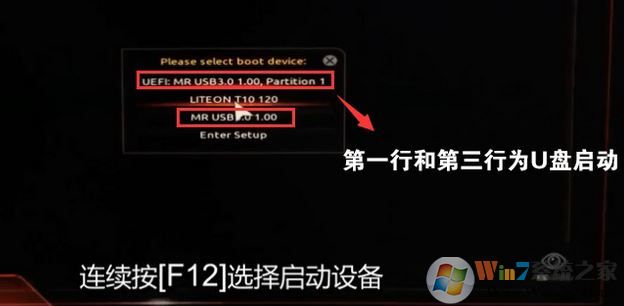 6、插入U盤啟動盤,重啟不停的按F12,選擇識別到U盤啟動項(默認有uefi U盤啟動和傳統(tǒng)模式,這里記得要uefi啟動的就要制作支持uefi的U盤啟動),回車,如圖所示;
