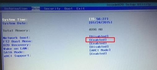 3、轉(zhuǎn)到Main,選擇F12 Boot Menu回車,設(shè)置為Enabled,按F10選擇Yes回車保存修改,如圖所示;