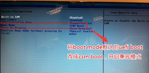 3、然后通過鍵盤上下鍵,選中“Boot Mode”選項,按回車鍵,將值設(shè)置為“CSM Boot”,開啟兼容模式,改完后F10保存,如下圖所示;