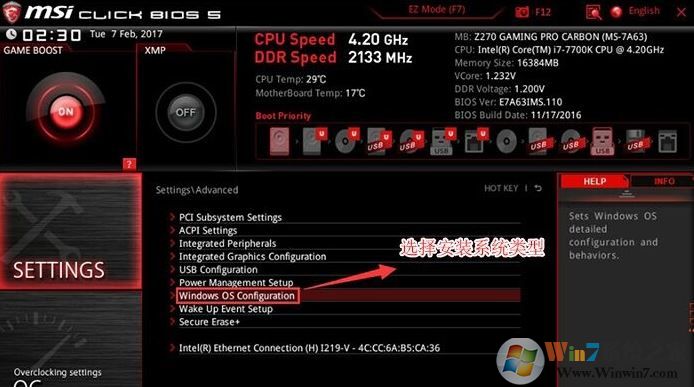 3、再將鍵盤方向盤往下移,移動windows os configuration選項選擇安裝系統(tǒng)類型,如下圖所示;