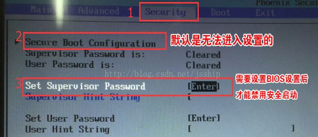 2、開(kāi)機(jī)一直按F2進(jìn)入BIOS,按F2進(jìn)入BIOS界面,切換到security選項(xiàng),準(zhǔn)備關(guān)閉安全啟動(dòng)那項(xiàng)時(shí),secure boot configuration無(wú)法正?;剀?chē)進(jìn)入設(shè)置,如果Secure Boot configuration灰色無(wú)法設(shè)置,則轉(zhuǎn)到Security,選擇Set Supervisor Password回車(chē)設(shè)置密碼,如照片所示: