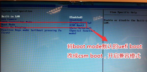 3、然后通過鍵盤上下鍵,選中“Boot Mode”選項(xiàng),按回車鍵,將值設(shè)置為“CSM Boot”,開啟兼容模式,改完后F10保存,如下圖所示;