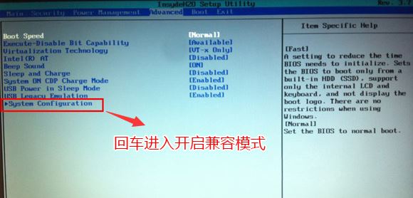 2、通過鍵盤左右鍵,選中“Advanced”選項(xiàng)卡;通過鍵盤上下鍵,選中“System Configuration”選項(xiàng),按回車。,如圖所示;