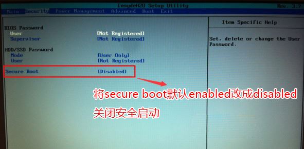 1、開機(jī),在Toshiba Logo處,按F2進(jìn)入BIOS,通過鍵盤左右鍵,選中“Security”選項(xiàng)卡;通過鍵盤上下鍵,選中“Secure Boot”選項(xiàng),按回車鍵,將值設(shè)置為“Disabled”關(guān)閉安全啟動(dòng),如下圖所示;
