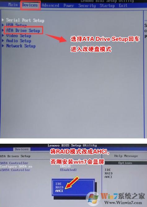 4、切將鍵盤移動Devices選項,把鍵盤移動ATA Drivers setup回車,將configure SATA as中默認(rèn)的raid改成ahci模式,否則安裝win7時會出現(xiàn)0x0000007b藍(lán)屏,因為win7中沒有集成raid硬盤驅(qū)動,然后選擇F10保存設(shè)置,在彈出的選項中選擇YES,如下圖所示;