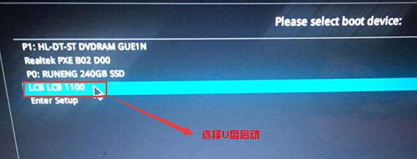 4、插入U盤啟動盤,重啟按ESC選擇識別到U盤啟動項,回車;