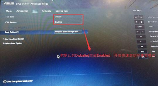 2、重啟后切換到BOOT的選項,分別把fast boot和csm support由disabled改成enabled,分別開啟快速啟動和兼容模式,如圖所示: