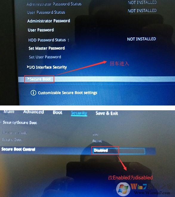 1、重啟筆記本按esc進入BIOS設(shè)置,然后按F7進入高級模式,按→方向鍵移動到Security,選擇Secure Boot,然后回車進入把Secure Boot control選enabled改為disabled關(guān)閉安全啟動,然后按F10保存重啟;