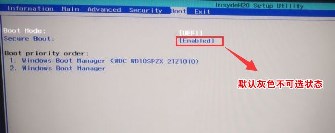 1、開(kāi)機(jī)一直按F2進(jìn)入BIOS,按F2進(jìn)入BIOS界面,選擇BOOT項(xiàng)后發(fā)現(xiàn)secure boot灰色不可選狀態(tài),如下圖所示;