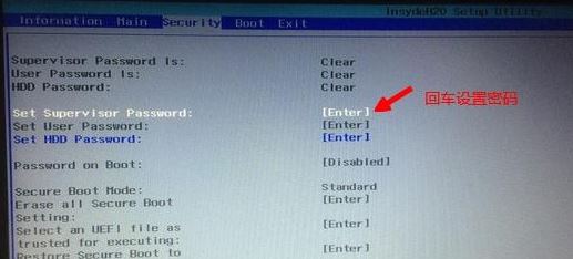 2、如果Secure Boot灰色無法設(shè)置,則轉(zhuǎn)到Security,選擇Set Supervisor Password回車設(shè)置密碼,再返回BOOT選項,將Secure BOOT默認(rèn)enabled為disabled,(注:改完secure boot后再設(shè)置密碼為空即可,要不每次進(jìn)BIOS都要設(shè)置)如下圖所示;