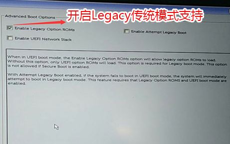 2、切換到Advanced Boot Options將右邊的Enable legacy option roms選項打勾,如下圖所示;