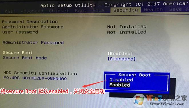 1、重啟筆記本按delete進(jìn)入BIOS設(shè)置,在Security下把Secure Boot Control設(shè)置為Disabled,關(guān)閉"安全啟動"項,然后按F4保存更改重啟,如圖所示: