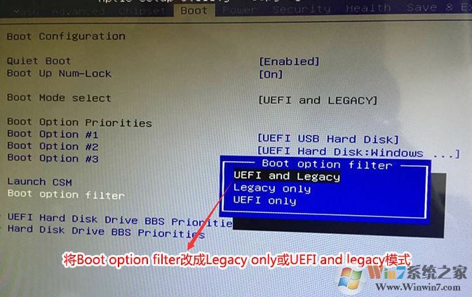 2、重啟后再按delete,進(jìn)入選擇Boot選項,將Boot option filer回車設(shè)置成legacy only或uefi and legacy,如下圖所示;