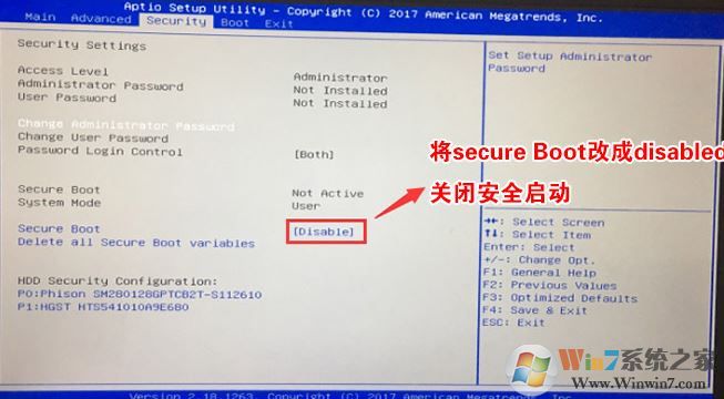 1、重啟筆記本一直按f2進入BIOS設(shè)置,在Security下把Secure Boot設(shè)置為Disabled,關(guān)閉"安全啟動",如圖所示: