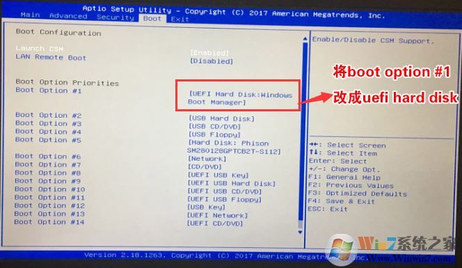 3、再將移動上下方向鍵,移動將Boot Option #1選項的啟動項更改為UEFI Hard Disk:Windows Boot Manager,如下圖所示,然后再F4保存設(shè)置;