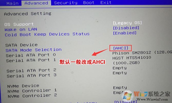 4、再將移動上下方向鍵,移動到Advanced中將SATA Mode Selection選項的啟動項更改為AHCI,否則安裝WIN7會出現(xiàn)0x00007b藍屏,如下圖所示,然后再F4保存設(shè)置;