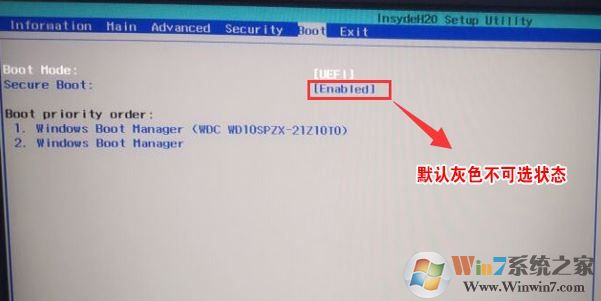 1、開機一直按F2進入BIOS,按F2進入BIOS界面,選擇BOOT項后發(fā)現(xiàn)secure boot灰色不可選狀態(tài),如下圖所示;