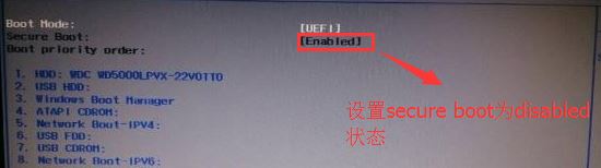 返回BOOT選項,將Secure BOOT默認enabled為disabled,關(guān)閉安全啟動