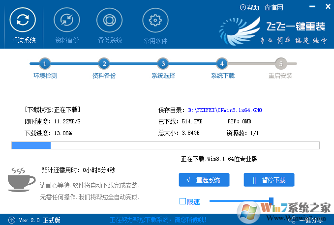 5、開始系統(tǒng)下載,下載速度視你的寬帶M數(shù)而定,耐心等待就行。這里軟件提供了重選系統(tǒng)、下載限速等功能,大家酌情使用!
