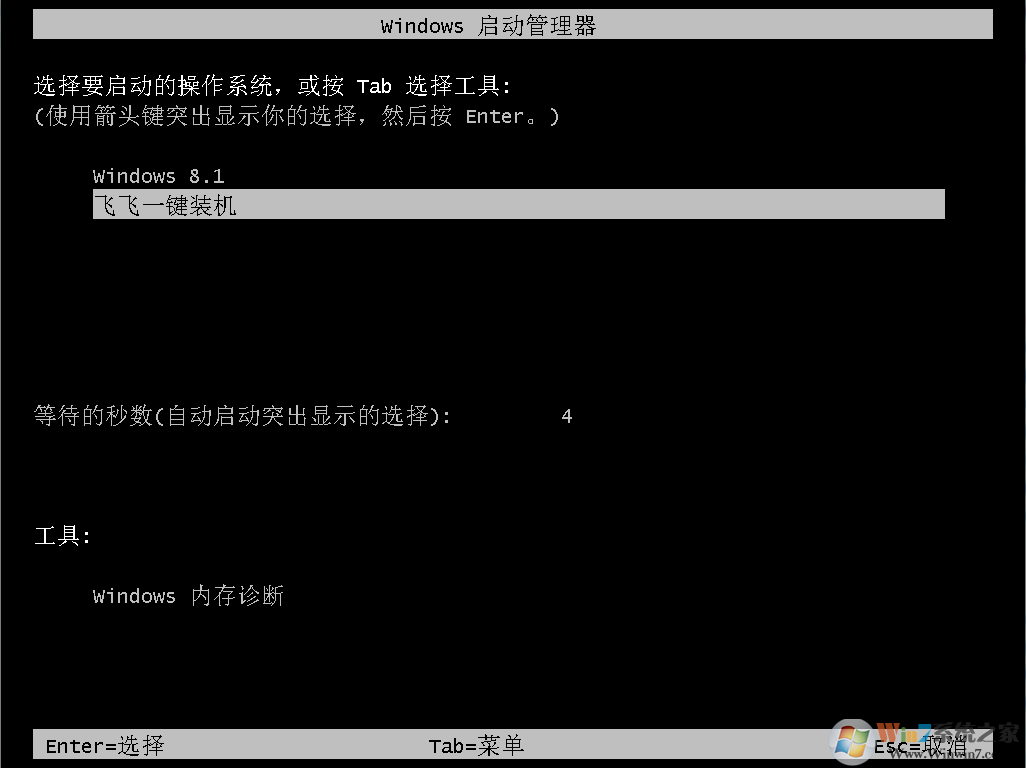 7、重啟后一切是自動(dòng)的,飛飛一鍵重裝會(huì)給Win8添加一個(gè)安裝啟動(dòng)項(xiàng),如下圖,自動(dòng)將進(jìn)行安裝。(借用Win8的圖,是一樣的)
