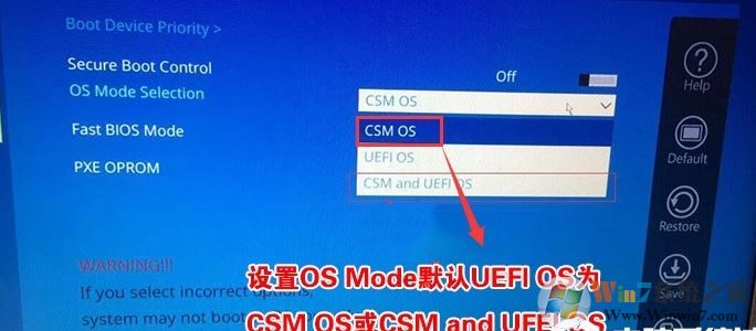 3、關(guān)閉安全啟動(dòng)后,BOOT選項(xiàng)中就會(huì)多出一個(gè)OS Mdoe Selection選項(xiàng),我們將默認(rèn)的UEFI OS改為CSM OS或CSM and UEFI OS,如下圖所示;