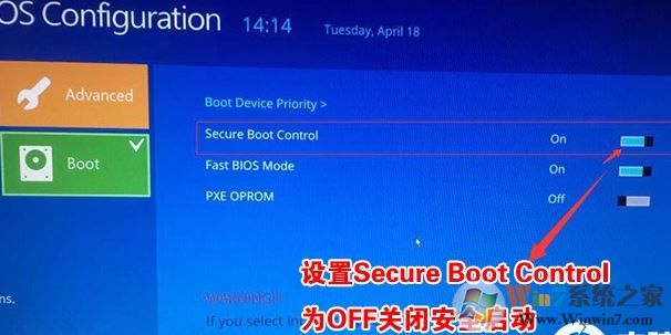 2、切換到BOOT的選項(xiàng),將Secure Boot Control后面的開關(guān)關(guān)掉(On變成Off),關(guān)閉安全啟動(dòng),該步是改WIN7的重要一步,如下圖所示;