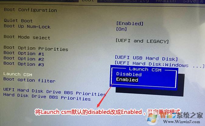 3、再將launch csm設(shè)置為Enabled,開啟兼容模式,如下圖所示,然后再F4保存設(shè)置;