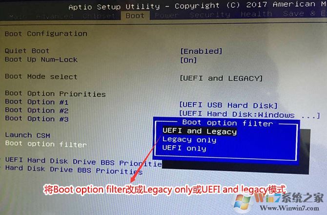 2、重啟后再按delete,進(jìn)入選擇Boot選項(xiàng),將Boot option filer回車設(shè)置成legacy only或uefi and legacy,如下圖所示;